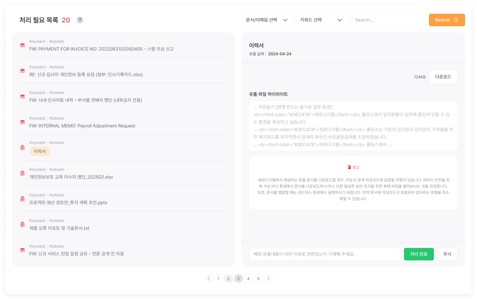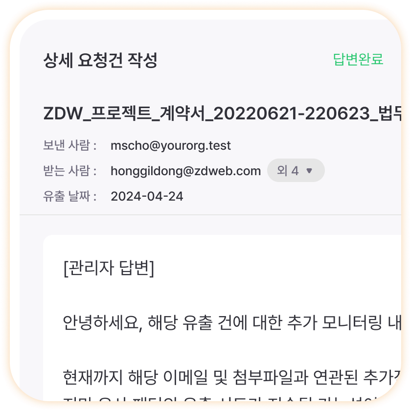 메일 첨부 파일의 유출 여부 및 탐지 상황에 대한 정보를 제공하여, 문서/이메일을 통한 데이터 유출 위험을 체계적으로 관리할 수 있도록 지원합니다. 탐지된 항목은 처리 필요, 처리 완료, 추가 문의 3단계로 분류되어 관리되어, 유출 위험에 신속하고 효과적으로 대응할 수 있습니다.