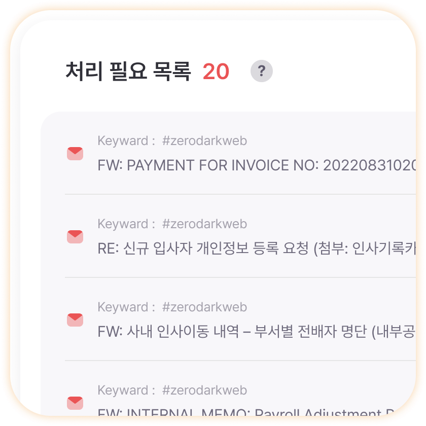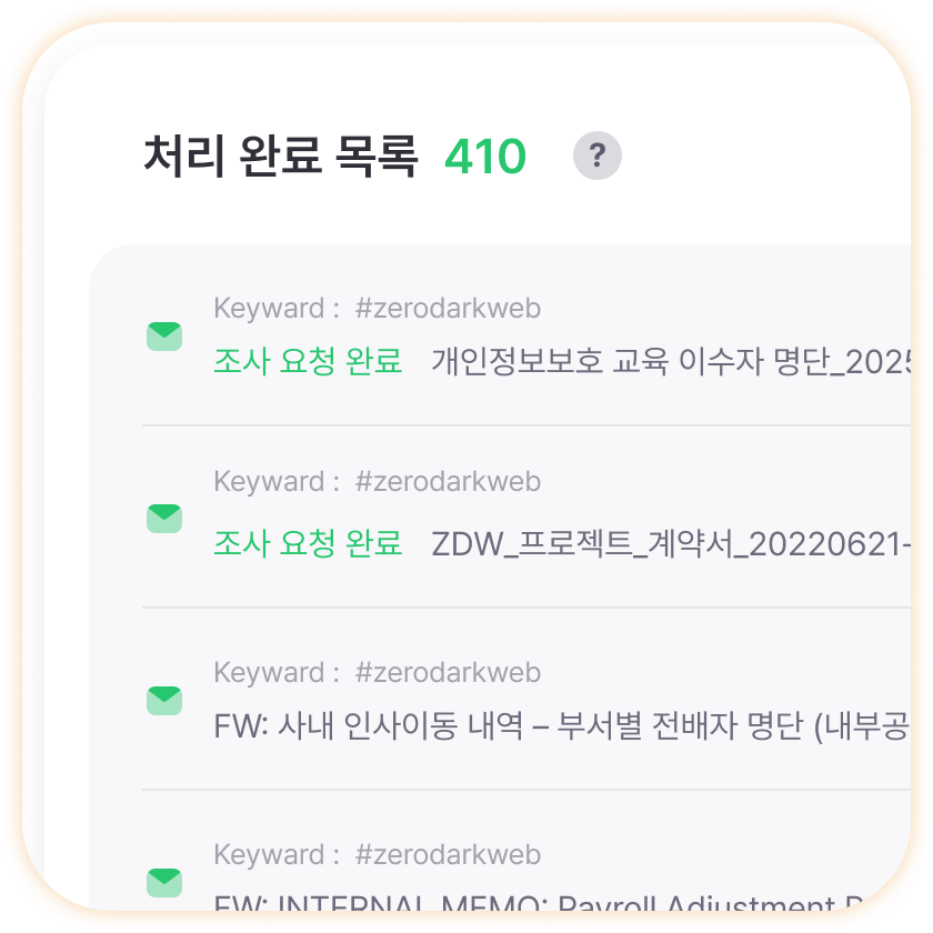 모니터링 키워드를 기반으로 다크웹에 유출된 문서/이메일 파일을 확인할 수 있습니다. ‘유출 파일 하이라이트’를 통해 내용을 빠르게 파악하고 즉시 대응할 수 있습니다.
