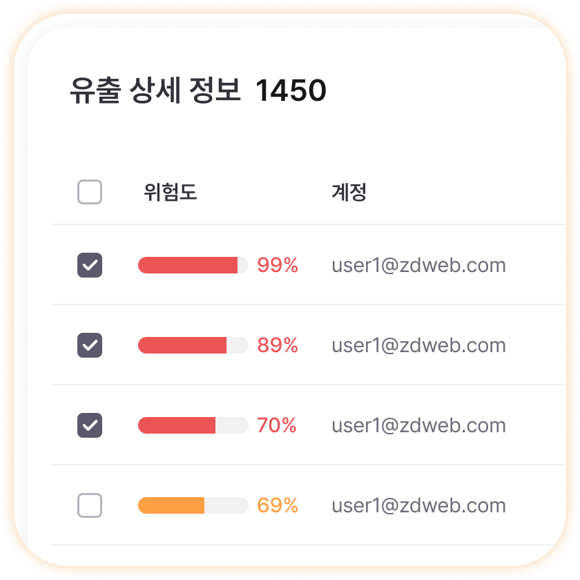 어떤 계정이 언제, 어떤 방식으로 유출되었는지 엑셀처럼 정리된 표로 한눈에 확인할 수 있어 대응 계획을 세우기 쉽습니다.