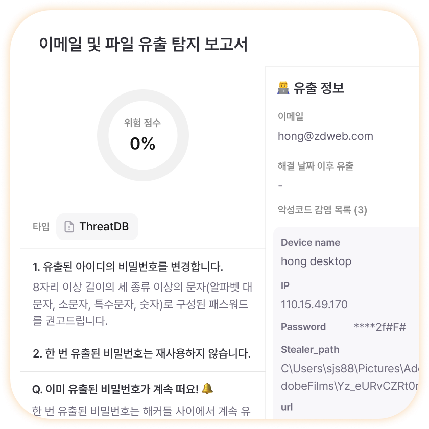 또한 과거 유출 이력, 재유출 시점 등을 추적하여 근본적인 보안 취약점을 찾아 해결할 수 있습니다.